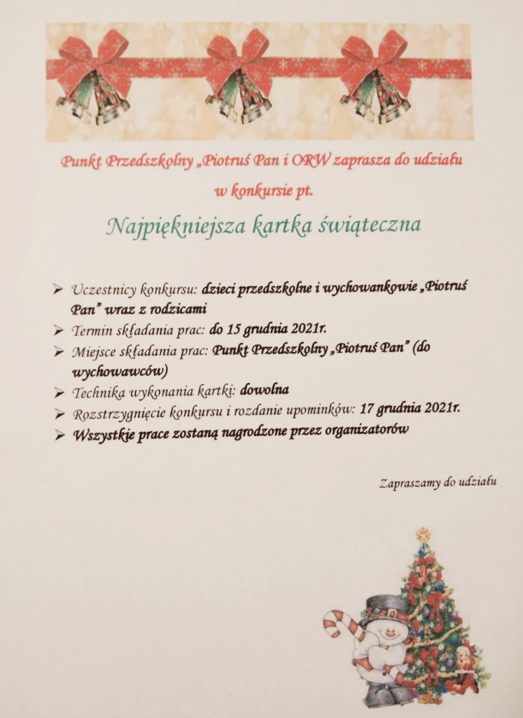 KONKURS :) Najpiękniejsza kartka świąteczna. 1 grudnia 2021 przez admin !!! KONKURS !!! Najpiękniejsza kartka świąteczna 🙂 . Zapraszamy do udziału Punk Przedszkolny „Piotruś Pan”, ORW. Poprzedni artykułProgram pilotażowy "Krótkowzroczność"Następny artykuł Podziękowanie