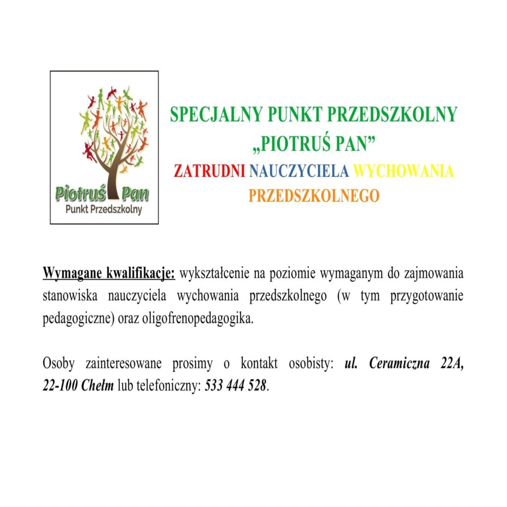 PRACA DLA NAUCZYCIELA WYCHOWANIA PRZEDSZKOLNEGO (REKRUTACJA ZAKOŃCZONA) 25 października 2022 przez admin Poprzedni artykułKonkurs Fundacji For Kids i EMPIS - zabawki edukacyjne.Następny artykuł PUNKT PRZEDSZKOLNY „PIOTRUŚ PAN” ZATRUDNI OD 01.09.2023 r. NAUCZYCIELA WYCHOWANIA PRZEDSZKOLNEGO !!!